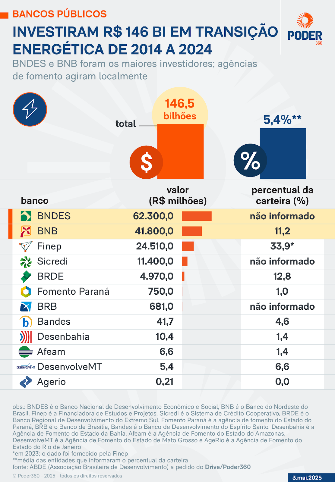 Segundo o estudo da ABDE, os investimentos nacionais somaram R$ 146 bilhões em projetos relacionados à transição energética, entre 2013 e 2023. Esses aportes envolveram desde grandes iniciativas em energia solar e eólica, até o financiamento de pequenas soluções sustentáveis em áreas como reciclagem, bioenergia e eficiência energética.